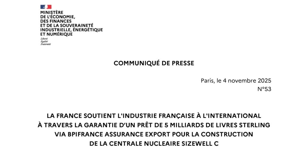 [COMMUNIQUÉ DE PRESSE] La France renforce son soutien à l’industrie nucléaire en garantissant un prêt de 5 milliards de livres sterling pour le projet Sizewell C au Royaume-Uni, porté par…